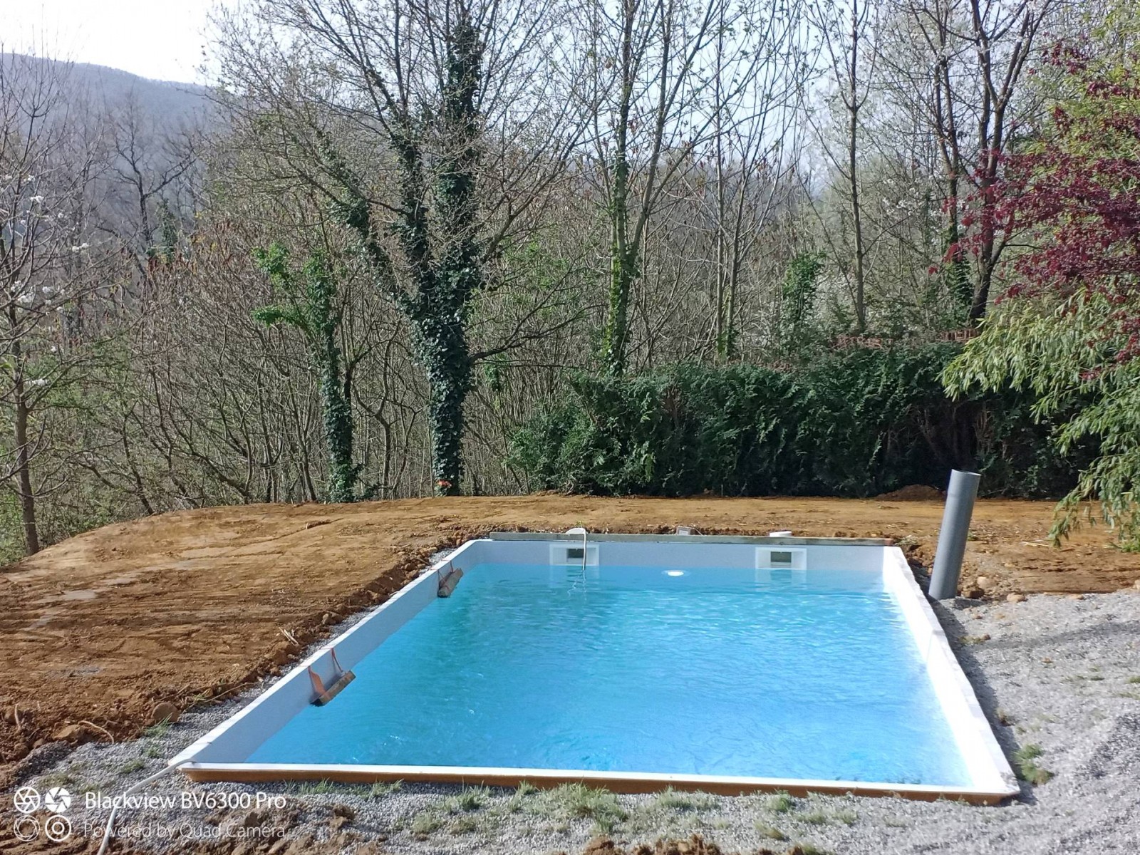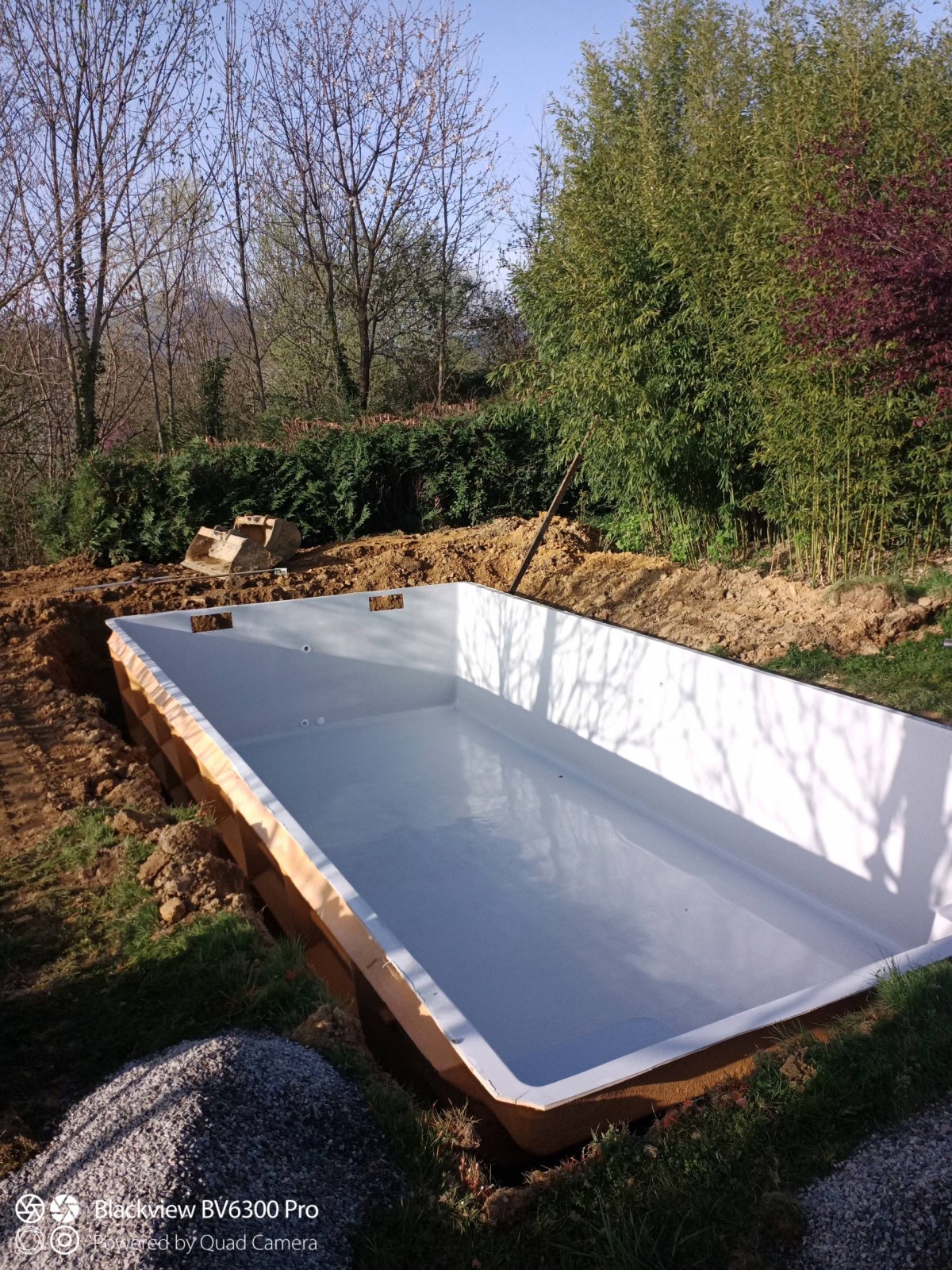 Piscine coque polyester Neptune Piscines de fabrication Française "8 x 4" fond plat Lac de Nantua de la gamme "contemporaine". Piscine à fond plat paroi lisse escalier sur la largeur avec banc de repos .