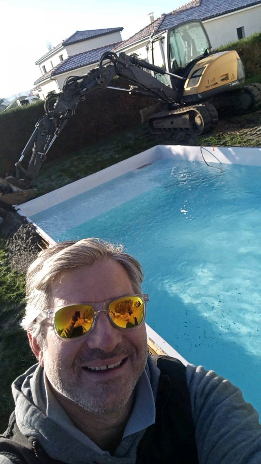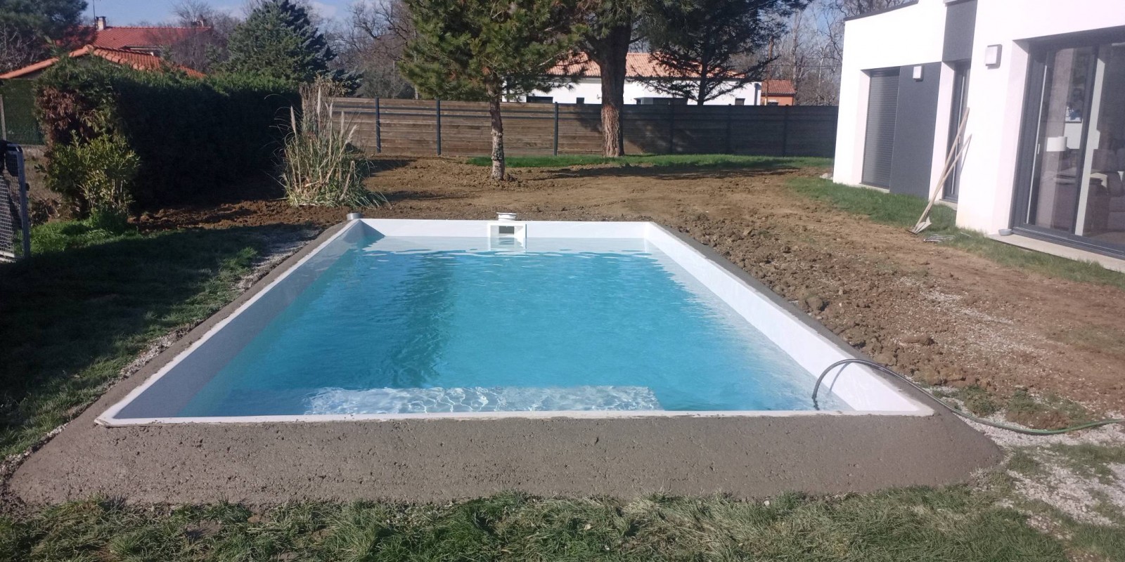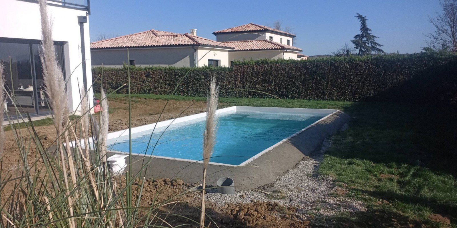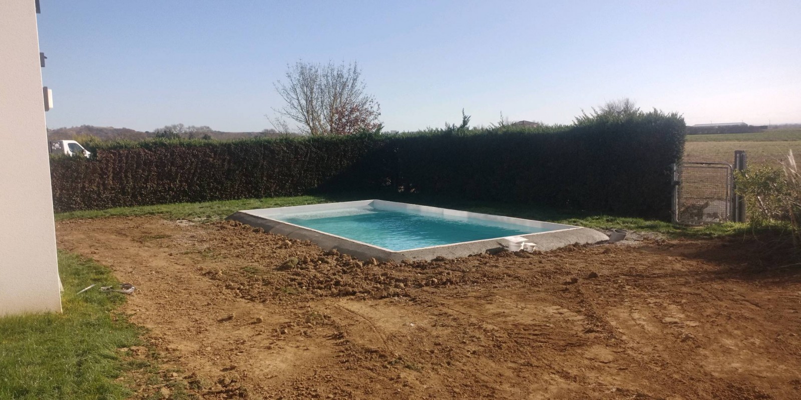 Jour 1 : implantation, terrassement et évacuation de la terre pour le modèle Lac du Bourget avec plage immergée.