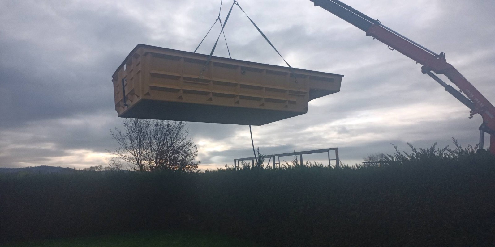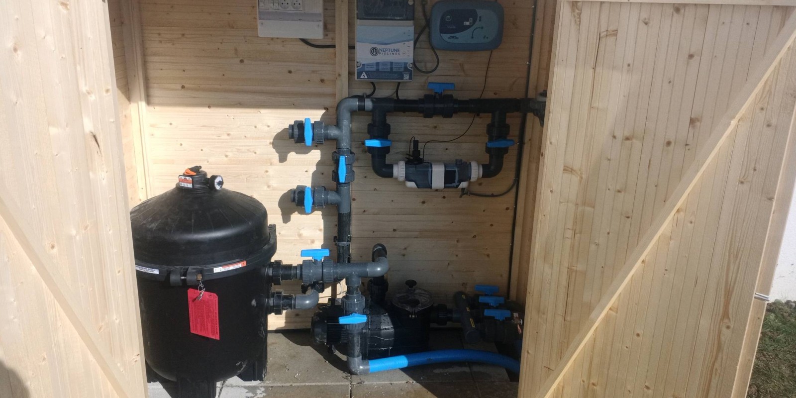 Jour 2 : livraison avec calage du bassin, installation filtration avec raccordement hydraulique à celui-ci.
